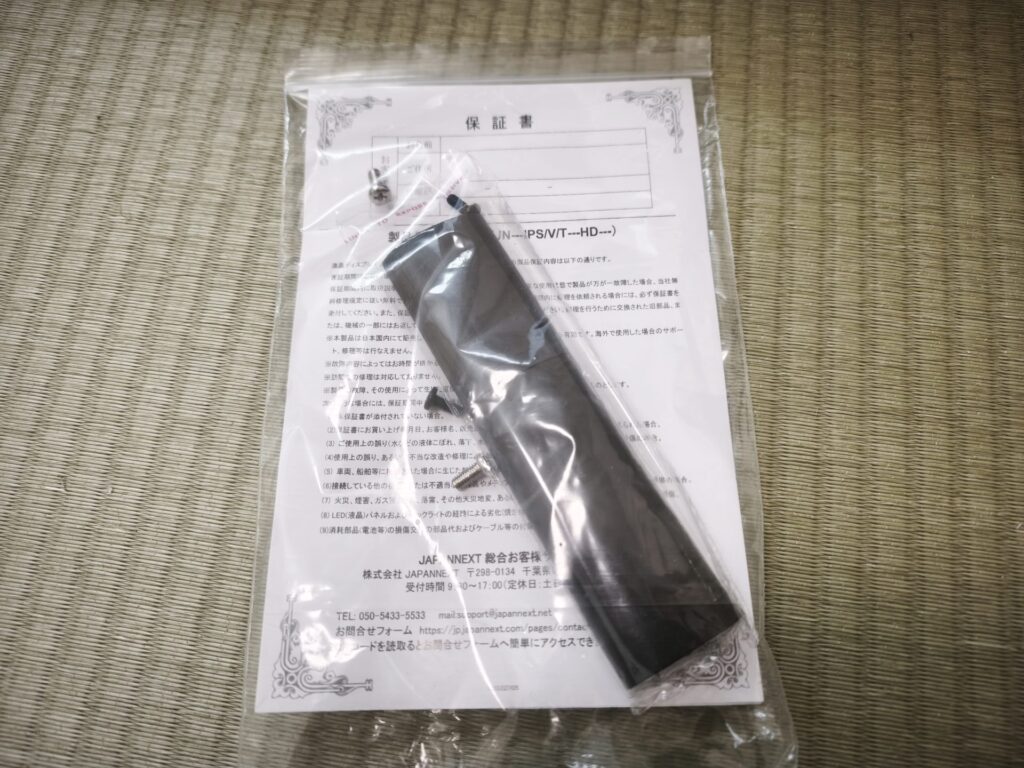 つづいてリモコンとネジ類、あと保証書です。最近は2年保証してくれているので非常に安心。
